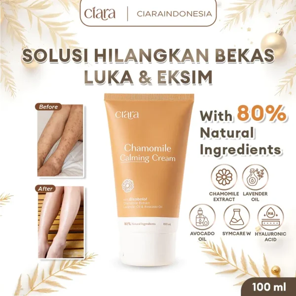 Body cream yang diformulasikan lebih dari 80% bahan alami untuk meredakan kemerahan, gatal dan mengurangi bekas luka. Dengan kombinasi Chamomile extract, Lavender & Avocado oil, Ciara Chamomile Calming Cream bekerja secara efektif untuk melembabkan, melembutkan dan menghaluskan kulit.